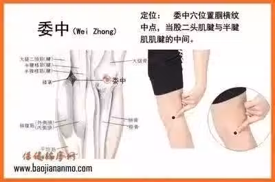 方法:拇指指端按壓兩側委中穴,力度以稍感酸痛為宜,一壓一松為1次,連坐10~20次。