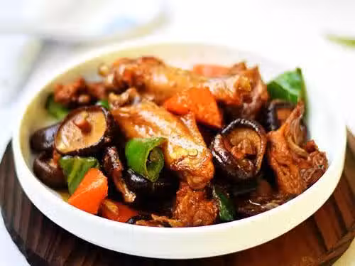 食材:雞肉、胡蘿蔔、香菇、青椒、生抽、老抽、姜、蒜、油、料酒、鹽