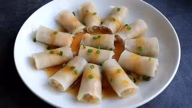 取一片蘿蔔皮放上馬蹄豬肉餡,捲成卷,收口朝下擺在盤中