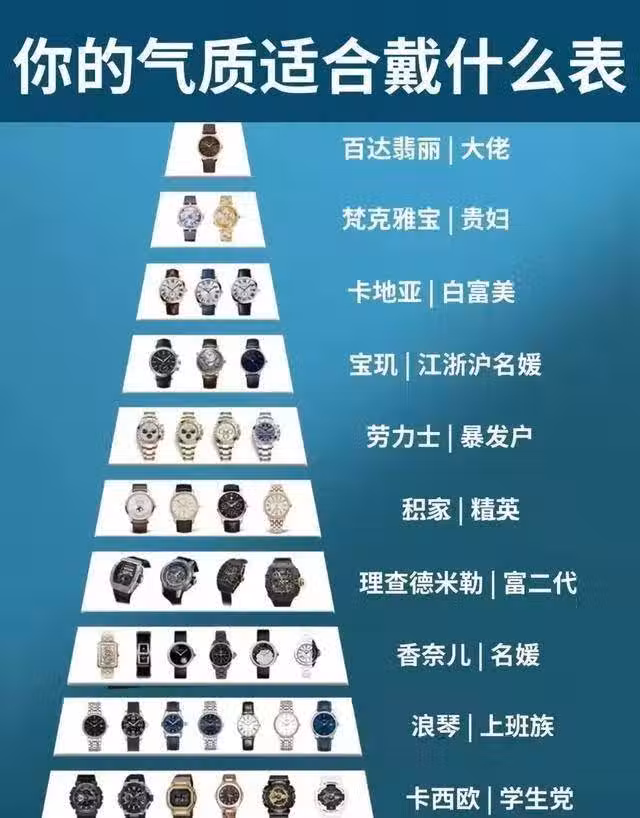 不同的手錶品牌早期的定位人群完全不同。有針對工薪階層的走量入門款、有針對商務人士的高端正裝表、也有專門針對成功人士的豪華表。