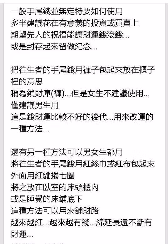 手尾錢是過去年代,一般人都是比較窮 除了房產地產,以及望生者生前配戴的的手鐲首飾當遺物