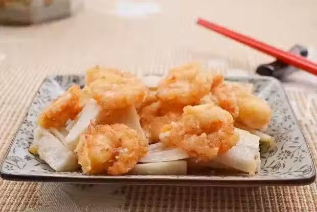 4、燒熱鍋內3湯匙油,爆香辣椒圈,將蓮藕倒入炒30秒後再倒蝦仁,加入1/3湯匙雞粉和1/5湯匙鹽翻炒入味。