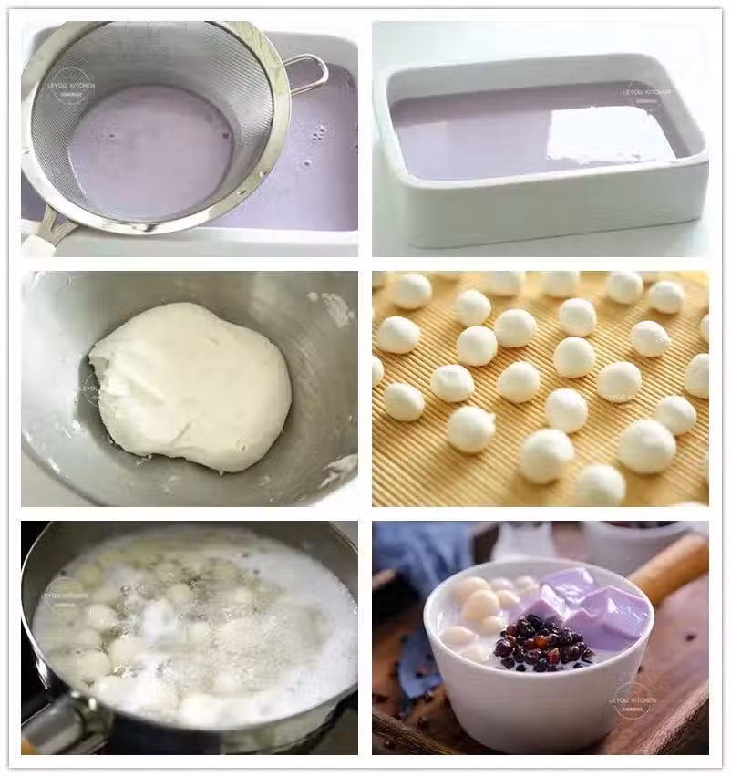 第十二步:鍋中倒入適量的水燒開,然後把搓好的圓子放入鍋中,煮至成熟,撈出,放入涼白開中,過一下涼水,使圓子溫度降下來。 第十三步:紫薯奶凍凝固後,在容器中劃成小塊,然後取一些放到碗里,再放入適量的蜜紅豆,糯米圓子,最後倒入適量的冷藏後的牛奶就可以開動了。