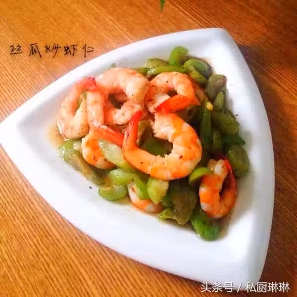 原料: 絲瓜、蝦中型、薑片、蔥段、蛋白、鹽、料酒、雞精、小蘇打、色拉油;