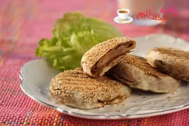 【麻醬燒餅】 原料:麵粉 芝麻醬 酵母粉 芝麻 椒鹽 製作:1. 用溫水加入麵粉和酵母粉中; 2. 和成軟硬適中的麵糰,