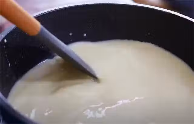 6.把火候調到中火,現在就要快速的攪拌,等鍋里的溫度到達一個點之後,澱粉水就開始慢慢的變得粘稠。