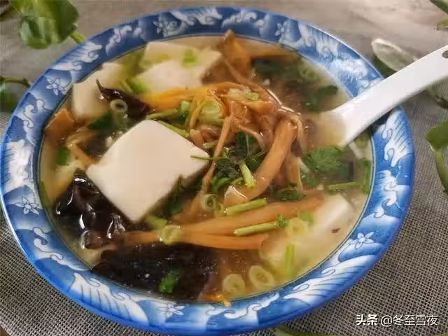 【什錦豆腐湯】所需材料:內酯豆腐1盒、木耳(干)、黃花菜(干)、香菜1棵、香油1湯匙、鹽適量、蔥1段、姜2片、白鬍椒粉1茶匙、雞精1茶匙、水澱粉適量。