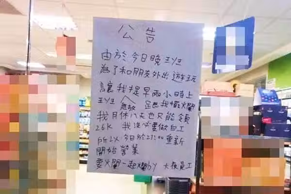 「我月休八天,也只能領26K,我沒必要做白工,所以今日於23:00重新開始營業。要爛一起爛,by大夜員工」。