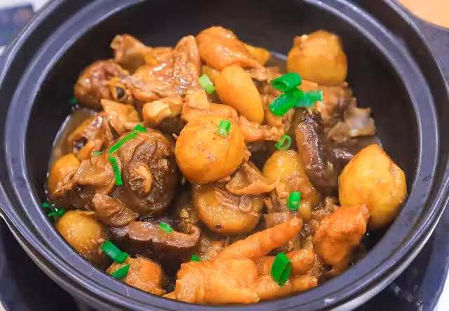 5. 15分鐘以後板栗能用勺子壓斷,差不多已經八成熟了,這個時候轉大火收汁,直至板栗完全熟透,湯汁收至濃郁粘稠時,把板栗雞塊放入砂鍋保溫,撒上蔥花,美味即成。