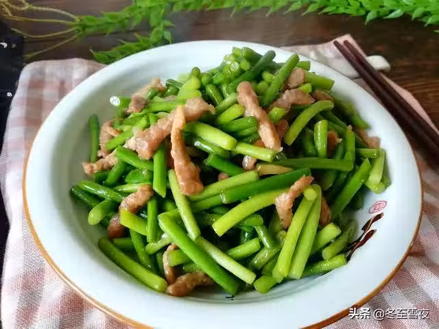 所需材料:蒜薹300克、豬肉150克、油鹽適量、姜2片、生抽1湯匙、料酒1\2湯匙、澱粉1\3湯匙、
