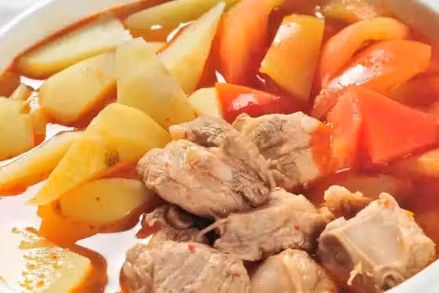 牛肉切片,番茄切塊,土豆切丁,三者加番茄醬、香葉、水煮至牛肉熟,加鹽、胡椒粉、味精調味。