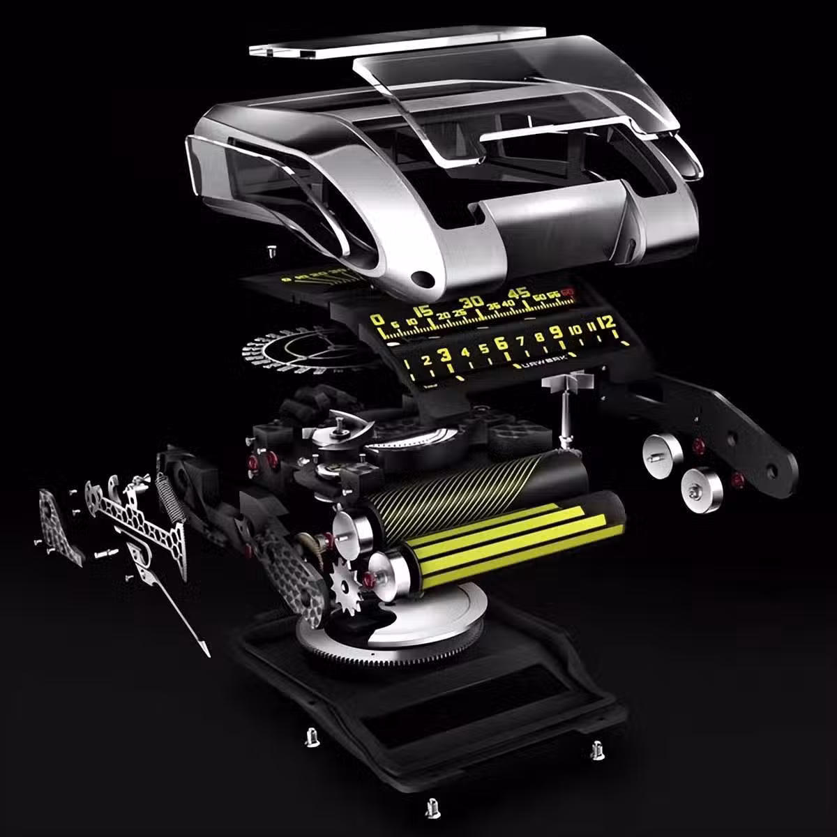 從表殼底部到頂部,三個不同的表盤提供小時、分鐘和秒——後者顯示為線性和數字。將手錶翻轉過來,時間顯示在表背上更加優雅。UR-CC1內部裝有一個完全為該應用從頭開發的機械機芯,手錶的設計旨在通過表殼上的一系列藍寶石水晶窗讓您一睹它的風采。沃爾克最初於2009年發布,僅生產了50件UR-CC1眼鏡王蛇。