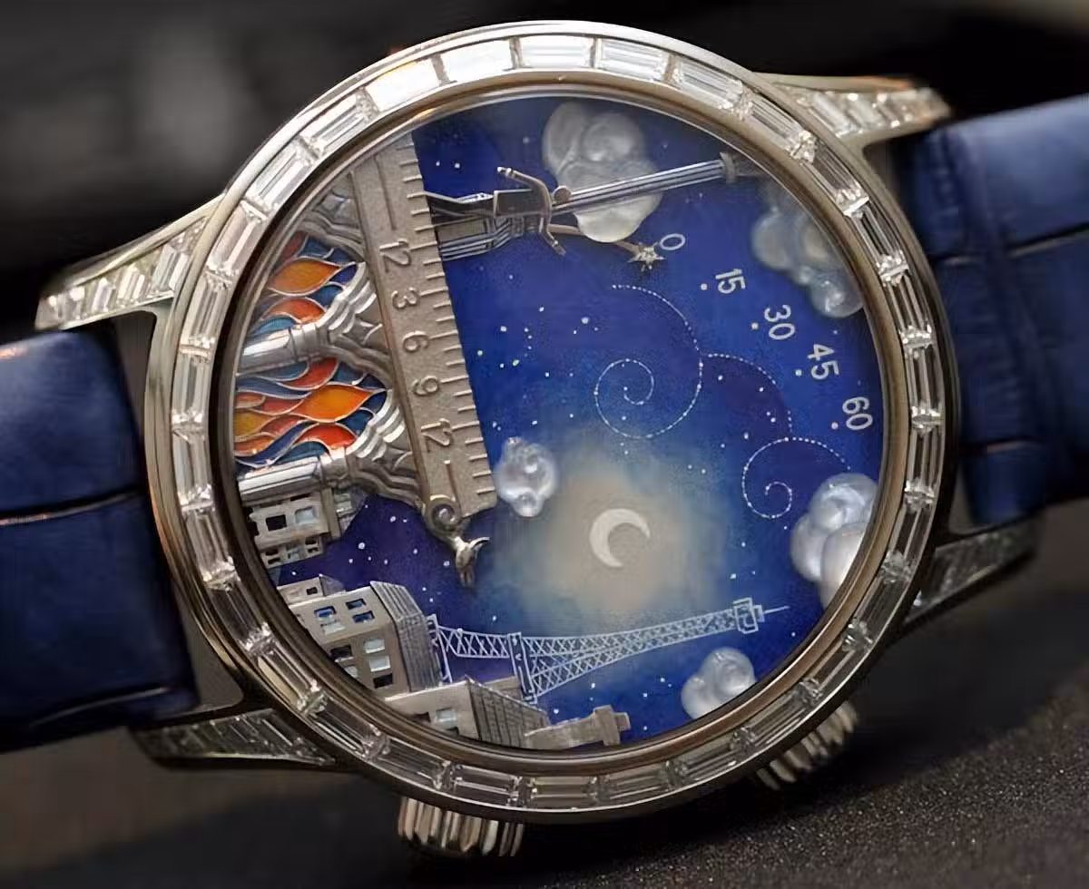 女士詩意心愿腕錶採用梵克雅寶的傳統表殼,鑲嵌鉆石,描繪出埃菲爾鐵塔的場景。這對夫婦中的女性角色站在塔頂,凝視著河對岸的巴黎聖母院。表盤是手工製作的,結合了雕刻黃金、雕刻珍珠母貝和細致的琺瑯彩繪等多種技術。大部分工作是在顯微鏡下完成的,需要大量時間才能完成。