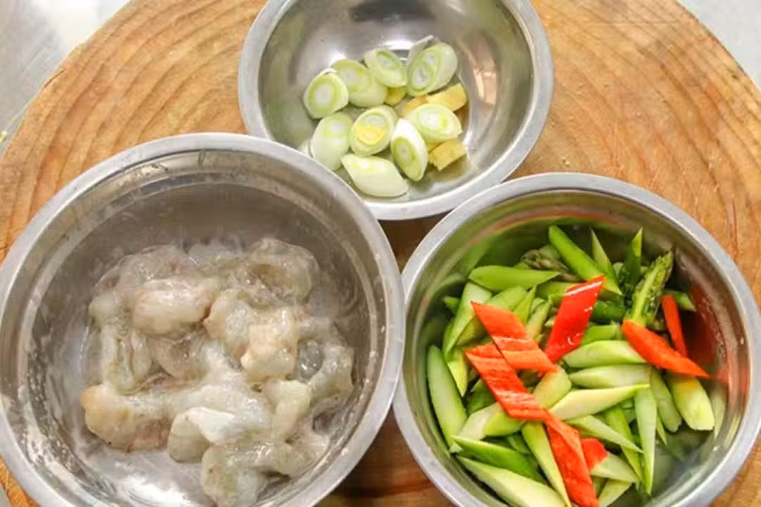 3.鍋內燒水,加入少許食鹽和植物油,水燒開後倒入切好的蘆筍、紅椒焯水20秒,蘆筍斷生返青以後倒出用清水沖洗、冷卻後用,清水沖洗能使蘆筍色澤更加青翠。