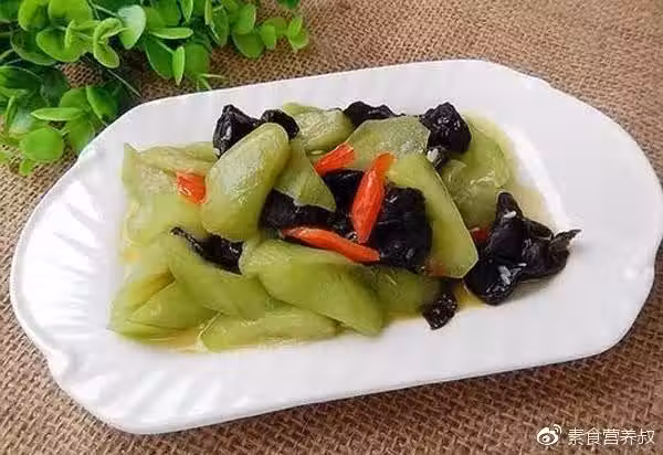2、鍋中油熱,下絲瓜、木耳翻炒至熟,出鍋前加適量鹽炒勻即可。