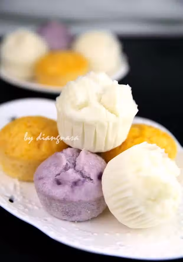 4.上色:將第三步的米漿分成三份,分別加 入20g粘米粉/玉米粉/紫薯泥,最後加入白糖拌勻,裹上保鮮膜發酵至面積漲大。