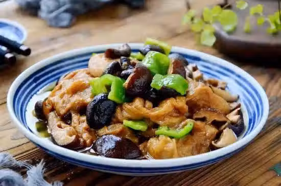 香菇40克、油麵筋20個、青椒半個、生抽1湯匙、植物油適量、甜麵醬1湯匙