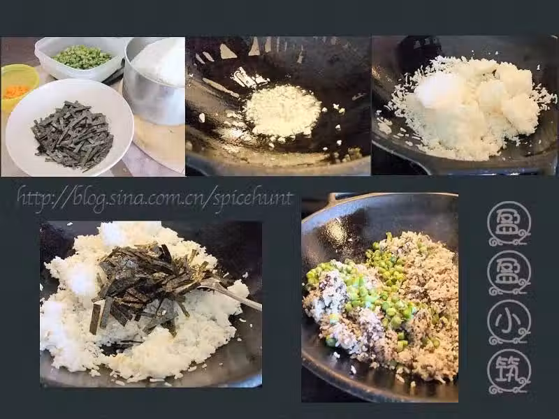 1. 在一口鍋里熱上兩大匙油,炒香,倒入米飯用鏟子炒散。