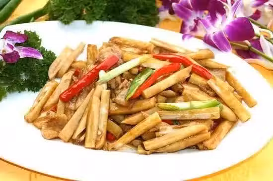 2、鍋中倒水燒開,把藕條放進去焯水,撈起後過下涼水,再控干水分