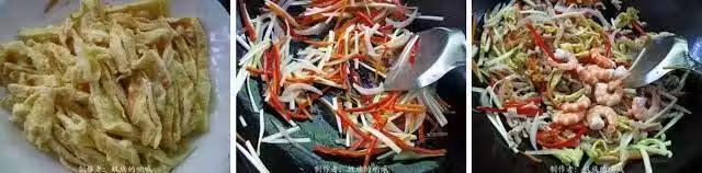 8. 熱鍋下油,先下洋蔥煸炒出香味,再依次加紅蘿蔔絲,紅椒絲,韭黃翻炒。