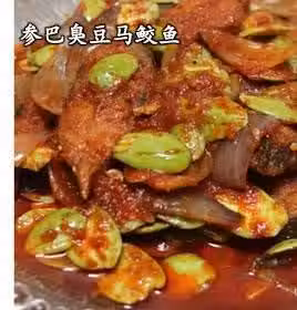 臭豆,馬鮫魚塊(加入少許鹽炸),大蔥 (切塊)適量,三巴辣椒 適量 調味料:鹽 適量,糖 適量,蠔油 適量,水 適量