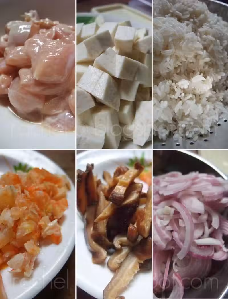 水 1杯半(我是放平時煮飯的水量)芋頭 250g蝦米 40g香菇 4朵雞腿肉 1隻青蔥 1根(我沒放)小蔥頭 6顆小辣椒 2條(切粒,加入黑醬油,生抽攪拌成辣椒粘醬)