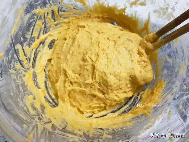 5、發酵好的麵糊再用筷子攪拌排氣,這時候麵糊看起來就很細滑