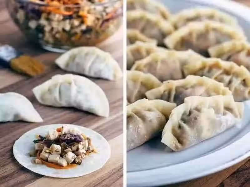 2、有了豆腐餡和餃子皮就可以來包餃子啦。