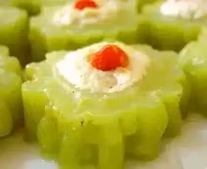 3、在苦瓜段里塞滿豆腐餡,用手輕輕壓緊,再在中間點綴一顆枸杞,全部做好後放入燒開水的蒸鍋內,用中火蒸至材料斷生即可。