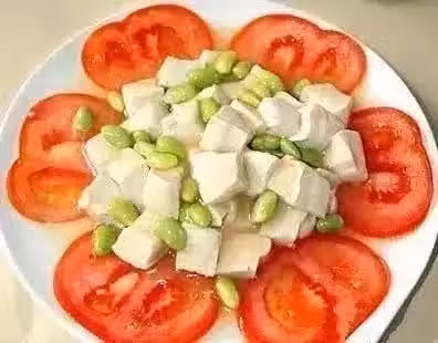 1、豆腐切小塊備用;番茄切片,圍盤邊擺一圈。