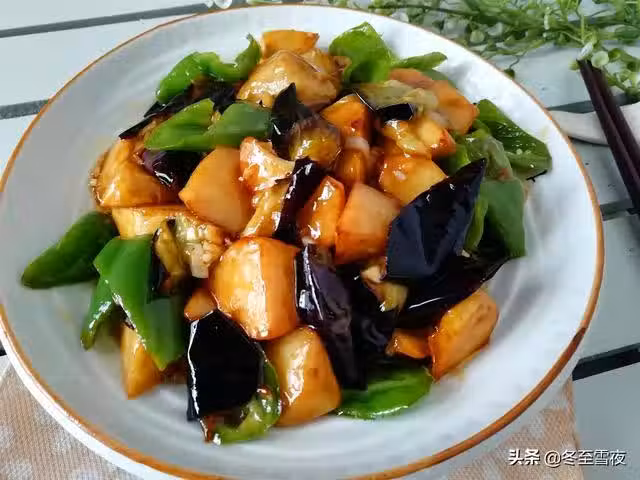 材料:茄子3個、土豆1個、尖椒1個 輔料:植物油適量、鹽3克、醬油1湯匙、姜2片、澱粉1/2湯匙