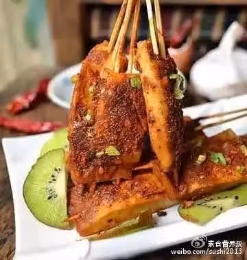 1.豆腐乾切塊,上花刀便於入味,用簽子串起來。