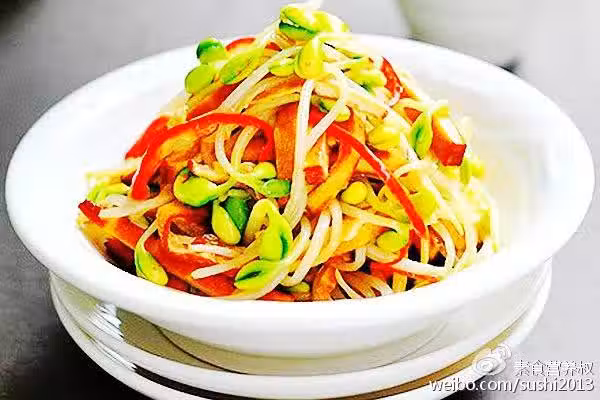 原料:黃豆芽200克、五香豆乾100克、生抽1湯匙(15ml)、油1湯匙(15ml)、白鬍椒粉1茶匙(5克)(5ml)、白砂糖1茶匙(5克)、芝麻香油1茶匙(5ml)