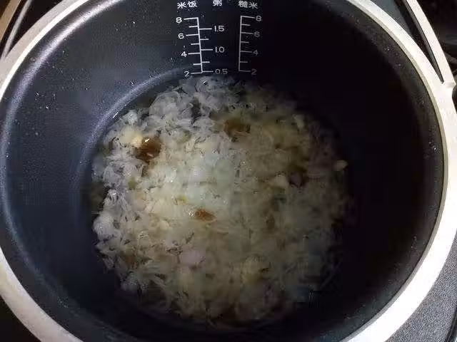5.把銀耳、皂角米和桃膠加入電飯煲,水量看刻度,煮大約30分鐘,加入冰糖和蔓越莓幹,再燉5到10分鐘。如果是幹銀耳,可以先把銀耳高壓鍋燉半小時,再進行此步驟。(建議吃新鮮銀耳,太方便了)
