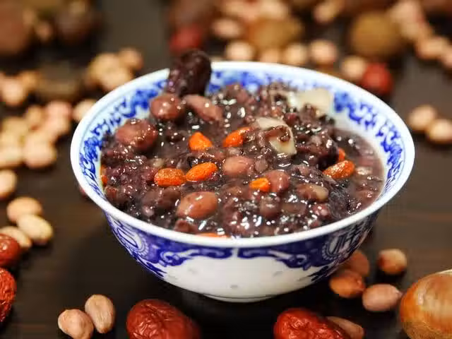 蓮子適量、花生適量、百合適量、紅豆適量、薏米適量、黑豆適量、大米適量、小米適量、小玉米茬適量、干棗適量、枸杞適量、紫米適量