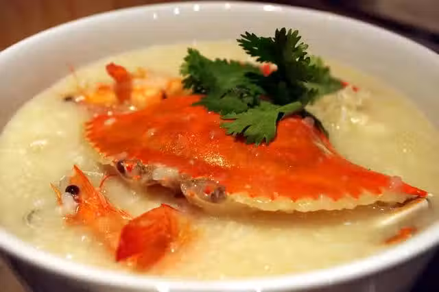 珍珠米50g、水適量、蝦100g、蟹150g、鹽少許、薑片適量、香菜少許