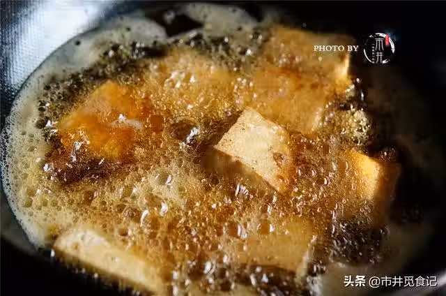 5、倒入炸好的豆腐塊,翻炒均勻吸收料汁後,略微變軟即可出鍋。