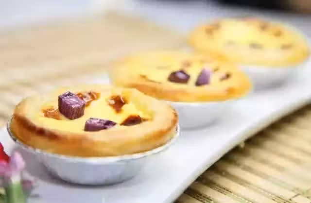 雞蛋黃2個、低筋麵粉7克、紫薯1個、冷凍蛋撻皮6個、淡奶油75克、牛奶70克、淡奶7克、綿白糖30克