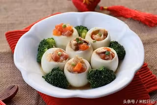 4. 將撈空的蛋擺在盤中,邊上用焯熟的西蘭花做裝飾,將炒好和雜丁裝入雞蛋盅。