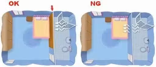 如果床靠的是浴廁外牆,為避免浴室濕氣影響到妳,請務必在浴廁外牆貼上一層木板,木材會吸濕,有阻擋濕氣入人體的功能,這樣子,人體就不會因為太潮濕而生病...健康,是一切的基礎,沒有健康光有財富,也無法享受,