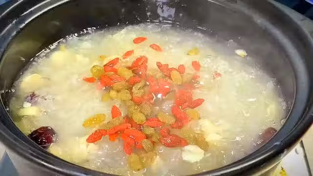 4.40分鐘後,鍋內已經變得濃稠了,倒入適量的葡萄乾和枸杞,