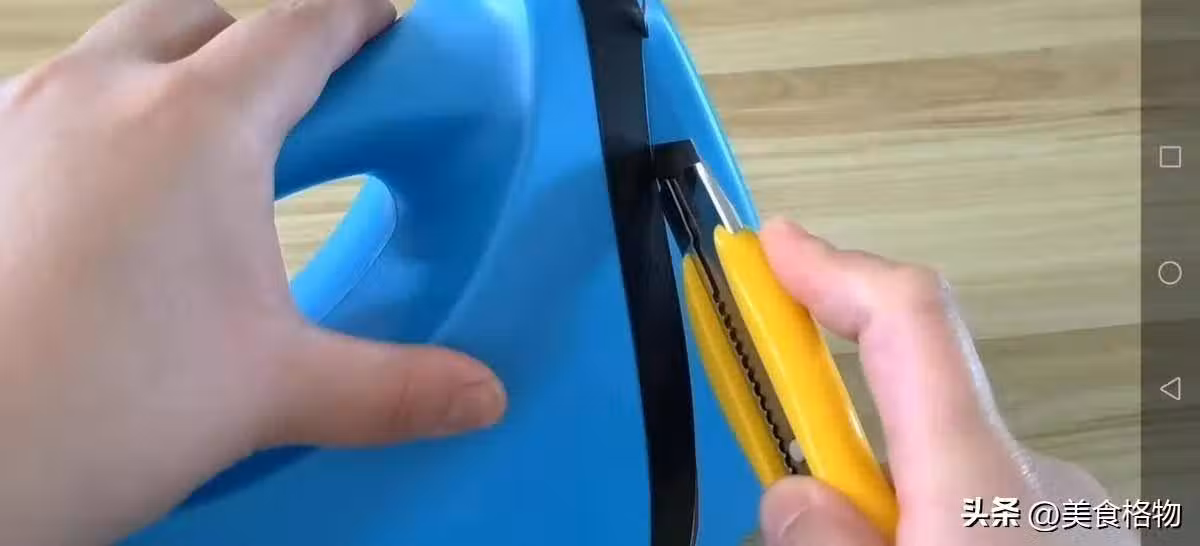 膠帶貼好之後,直接用壁紙刀沿著膠帶邊緣將其裁剪開,裁剪的過程中小心仔細,不要傷到手。用壁紙刀劃開,或者用剪刀沿著膠帶的方向將其剪開,這個步驟一定要劃的直一些,因為剪掉的洗衣液桶底部我們一會兒還要留著當做蓋子,所以這一步劃開的時候一定要保證它的美觀性,劃開之後就可以將多餘的膠帶直接給它揭掉了。