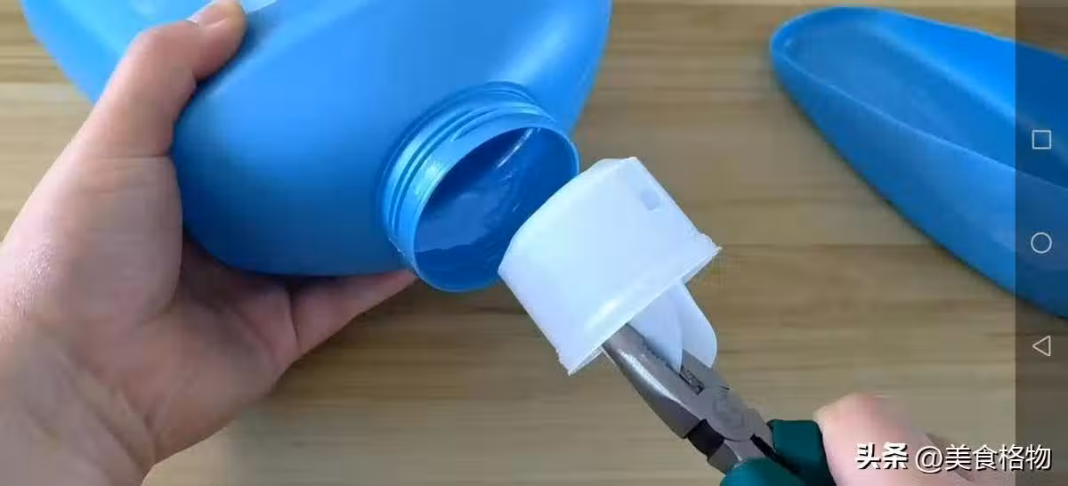 第二步,找一個尖頭的小鉗子,把洗衣液瓶口出口處這個白色的內芯給它拔出來,這個地方沒有用直接扔掉。