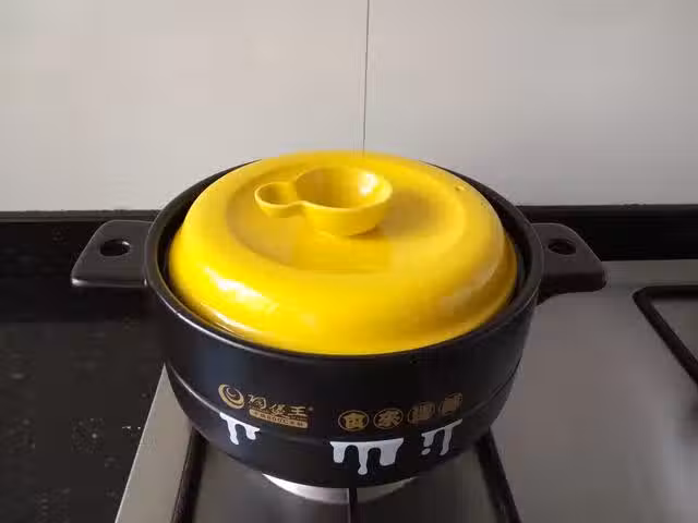 9.再加入少許水,蓋上鍋蓋,小火燜煮10~15分鐘。(我鬧鐘定了15分鐘,感覺南瓜很軟了。建議在12分鐘以後可以看下,差不多了就可以關火,燜幾分鐘,因為關火以後砂鍋裡面還是能維持高溫很久的。)