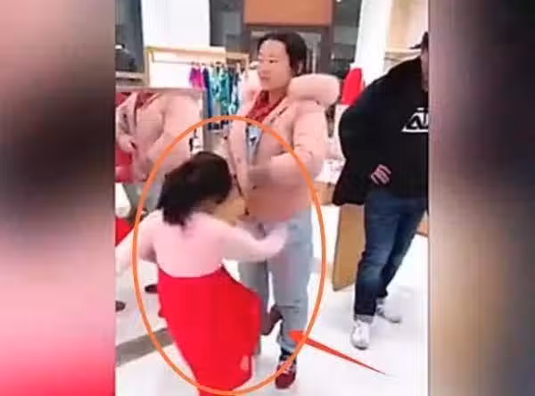 本來媽媽是想帶著孩子去買飲料的,但是路過一家衣服店,看到裡面有自己喜歡的衣服,所以一家三口就進入了衣服店,估計是買衣服買久了,孩子有些煩躁,而媽媽似乎也忘記了給女兒買飲料,女兒就想拉著媽媽去買,媽媽還沒逛完衣服,讓女兒稍等一下, 這時候女兒的小性子就上來了,硬是想拉著媽媽走,開始撒潑,並對著媽媽連環踢打。