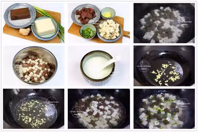 第八步:把豆腐和鴨血撈出放入鍋中,如圖,再放入1勺鹽調味,燒開後煮1-2分鐘。