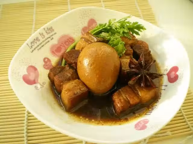 3、等滷肉五成以上熟的任何時候加入鹽和雞蛋和糖,一同滷製;
