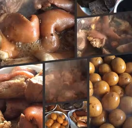 五花肉;雞蛋個;桂皮適量;冰糖適量;茴香適量;生抽適量;八角適量;薑片;花椒適量;胡椒適量;豬頭肉適量;豆乾適量;草果二粒;香葉少量;牛肉適量