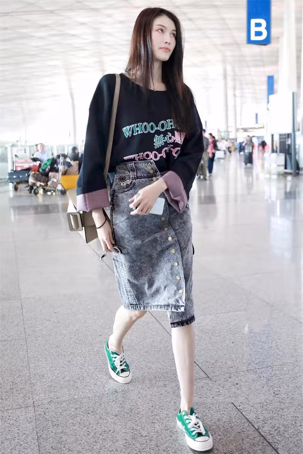 豹紋元素的帆布鞋看起來既性感又張揚,還帶有一絲野性,這樣看來可能有些女生會覺得不太好駕馭。其實我們可以學習楊冪這樣,選擇用豹紋元素的帆布鞋搭配一條同元素的半身裙,不僅讓一身看起來比較整體,還把不同層次的豹紋穿出了不簡單的感覺,學生黨也可以這麼搭配。