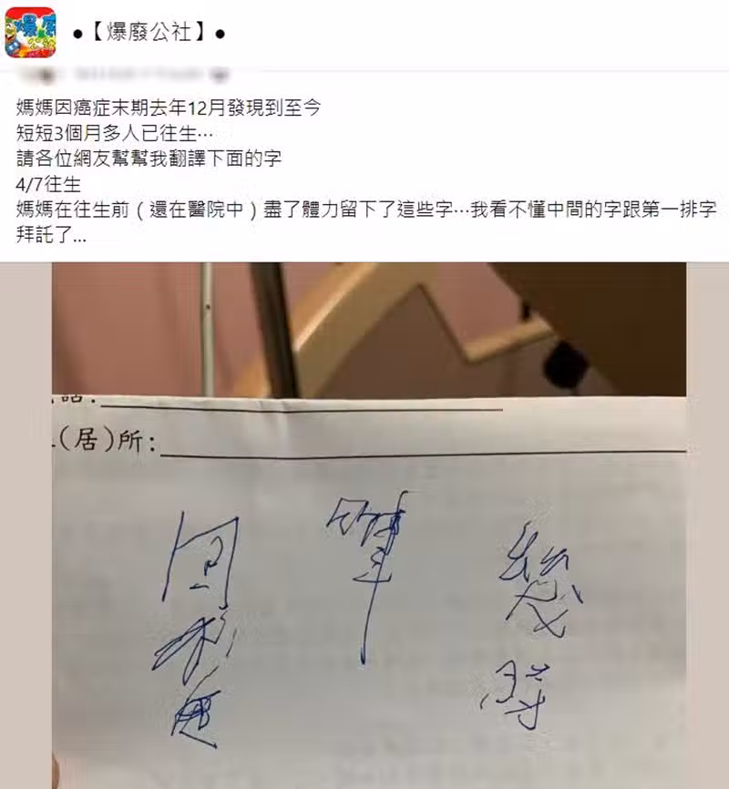 癌末媽用盡力氣留遺言 兒子看不懂求救「解出6字」讓眾人鼻酸